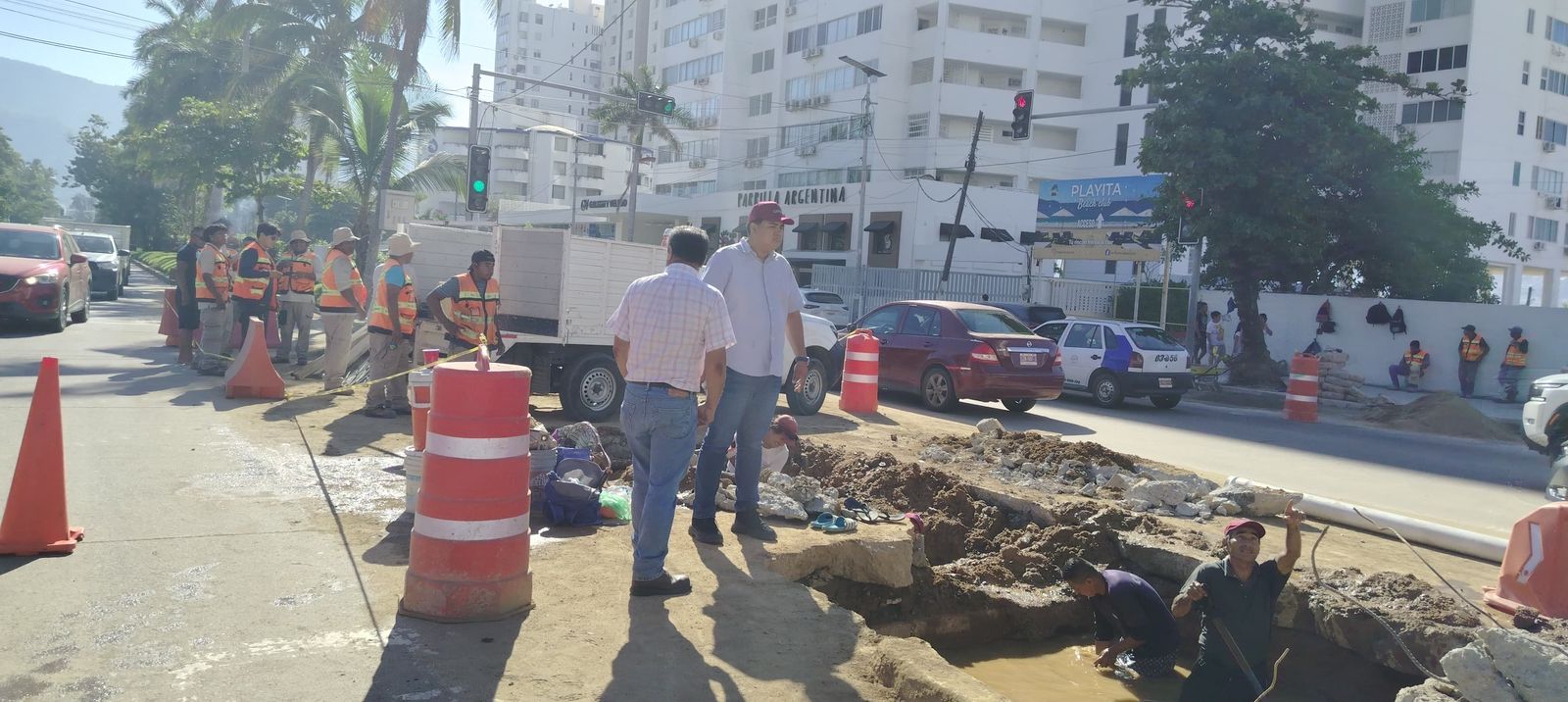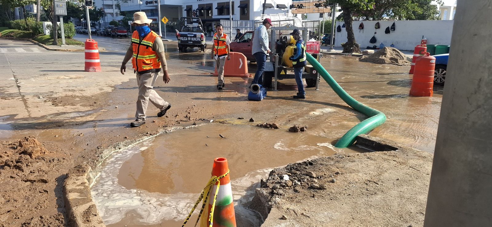 Acapulco, Gro, a 15 de diciembre del 2025. Personal operativo de la Capama llevó a cabo la reparación de una fuga de agua potable sobre la costera Miguel Alemán a la altura de la Condesa, lo que ha limitado el servicio por algunas horas en la zona turística.