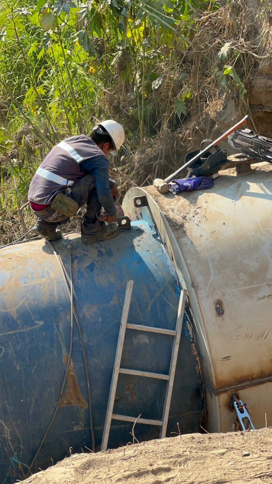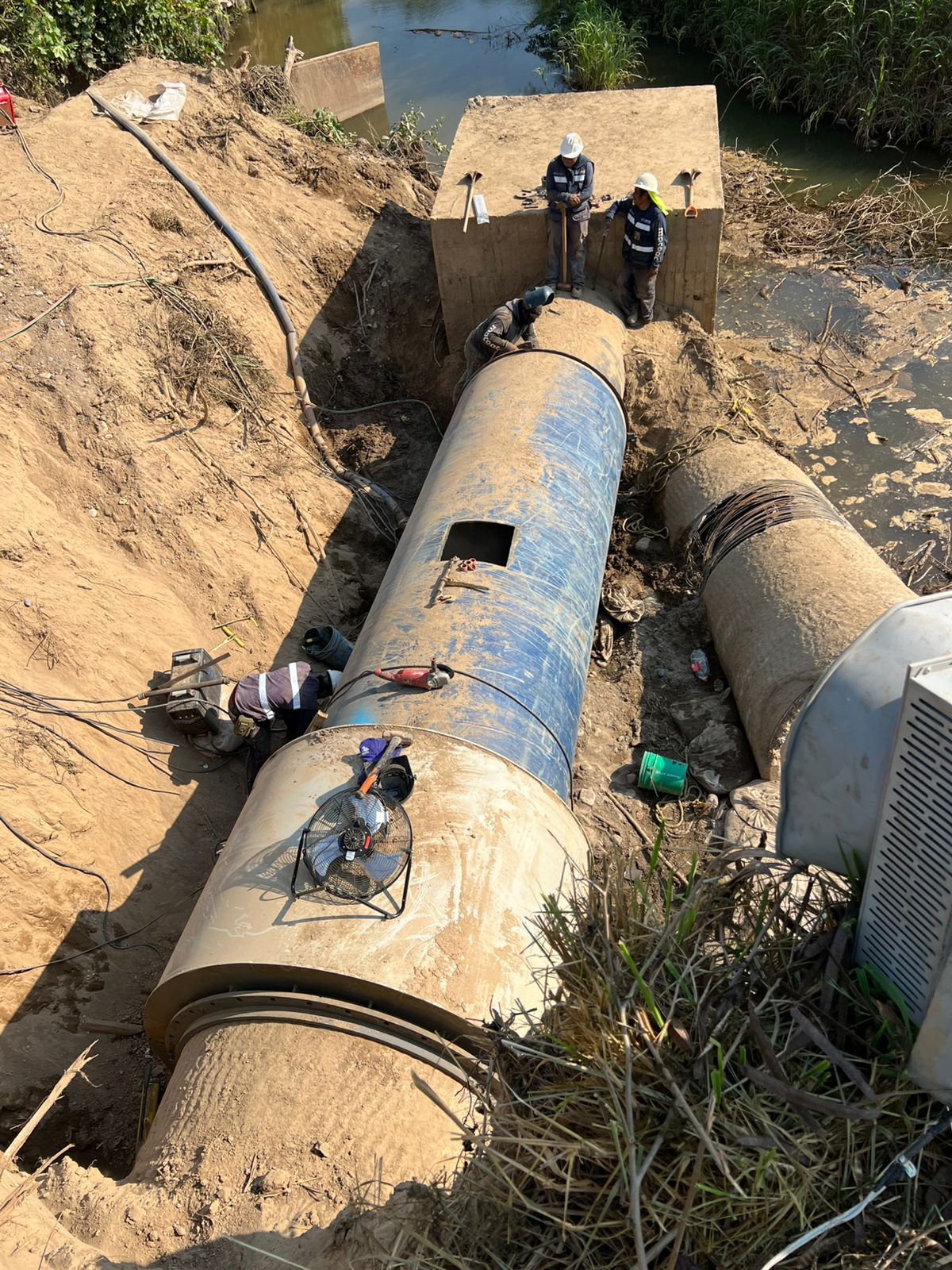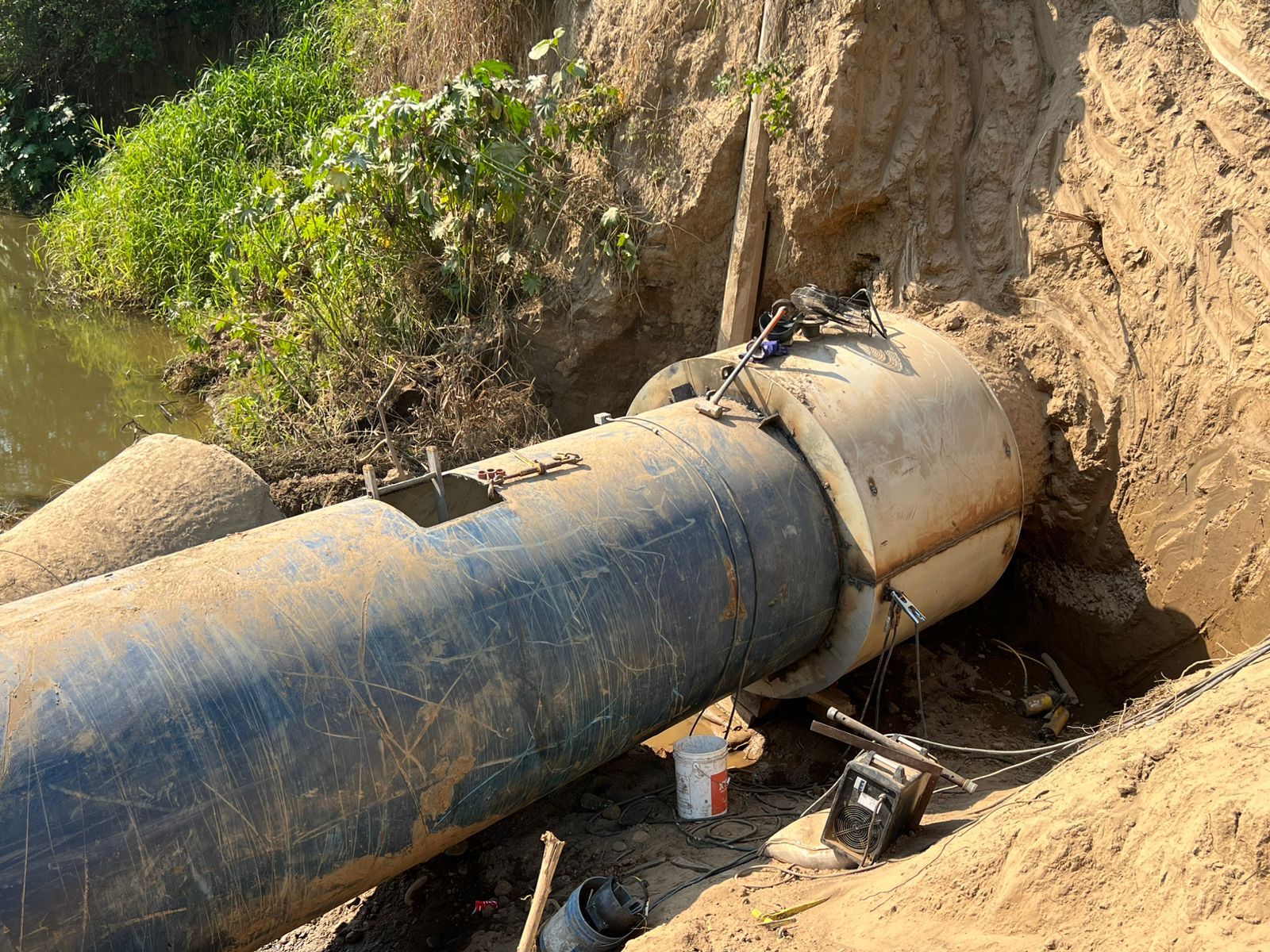Durante la jornada, los soldadores unieron cada segmento de la tubería, retiraron la sección fracturada de concreto y, con apoyo de maquinaria pesada, excavaron la zona para trabajar con precisión y asegurar el éxito de la reparación.