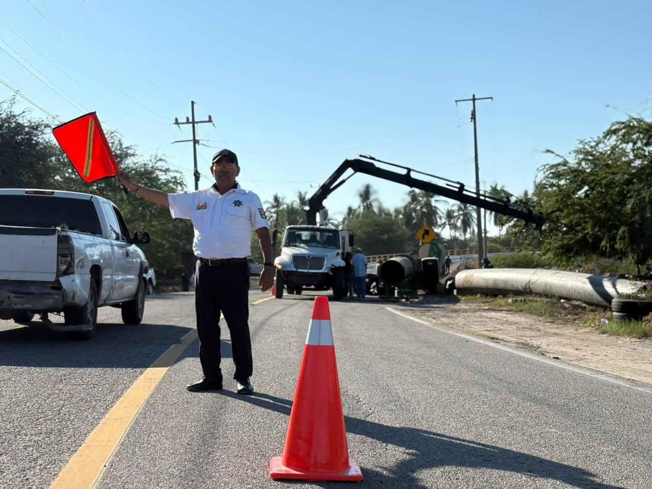 Para garantizar la seguridad de los trabajadores y de los automovilistas que circulan por la zona, la Policía Vial Municipal implementa medidas de control vehicular sobre la carretera.