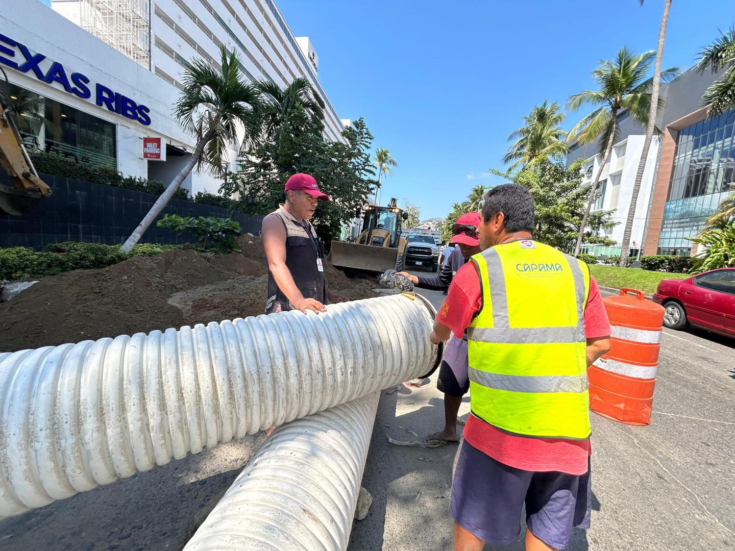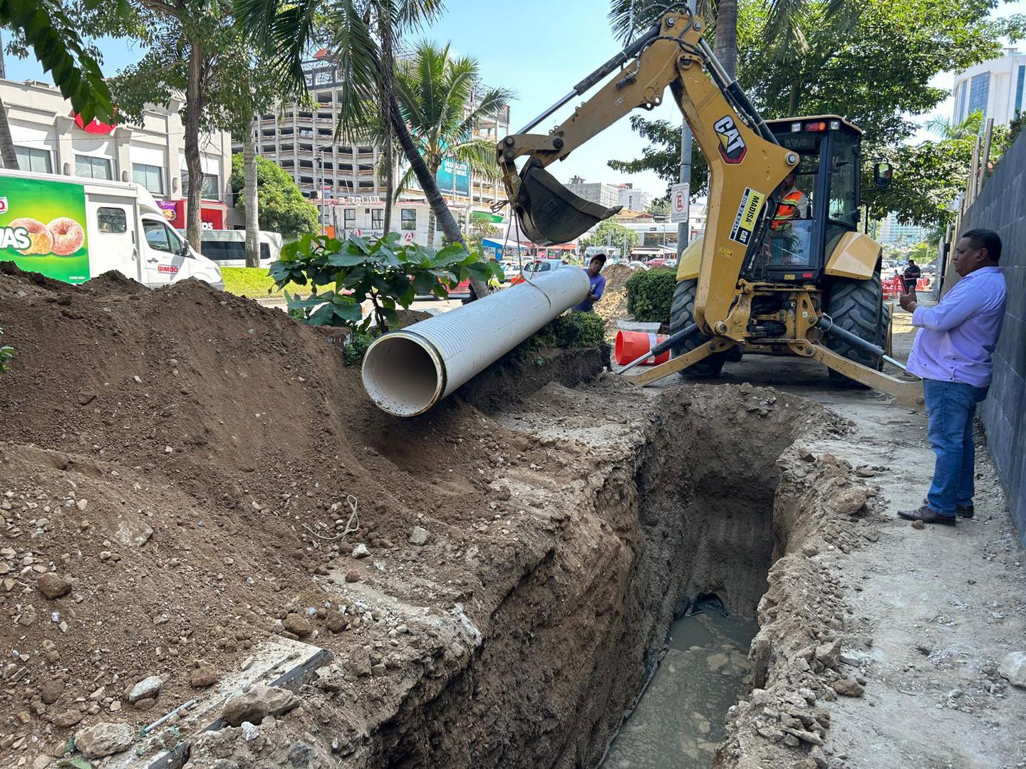Sobre la avenida Costera Miguel Alemán, a la altura del hotel Emporio, se sustituyó un tramo de 33 metros de tubería de drenaje sanitario de 12 pulgadas de diámetro. Estas labores se efectuaron en coordinación con personal de Fonatur, responsable del material, mientras que Capama contribuyó con la mano de obra especializada.