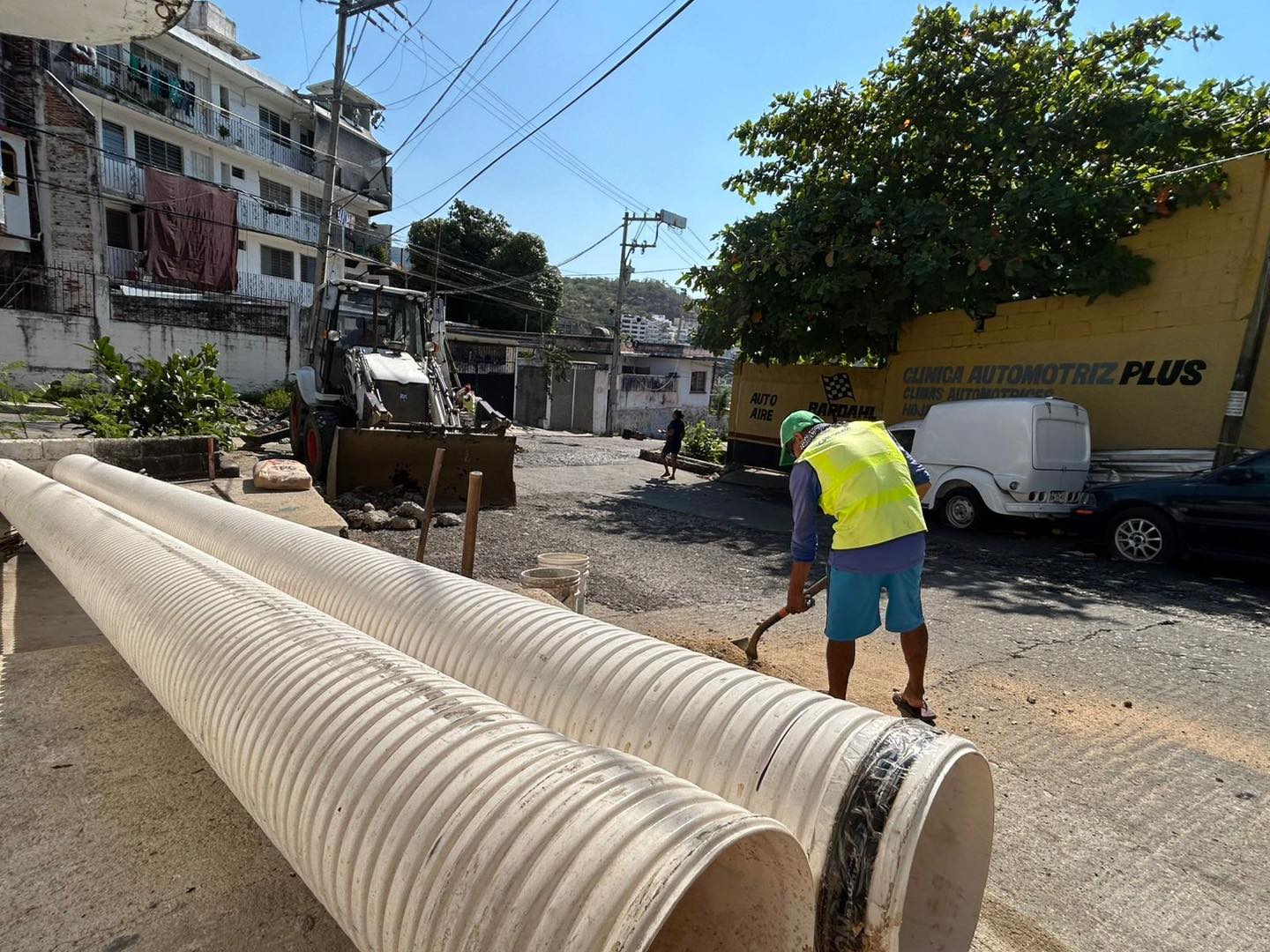 En la calle del Taller de la colonia Jacarandas, se rehabilitó un tramo de drenaje sanitario colapsado, donde se reemplazaron 11 metros de tubería de 10 pulgadas; además, se utilizó maquinaria pesada para garantizar la correcta instalación y funcionamiento del sistema.