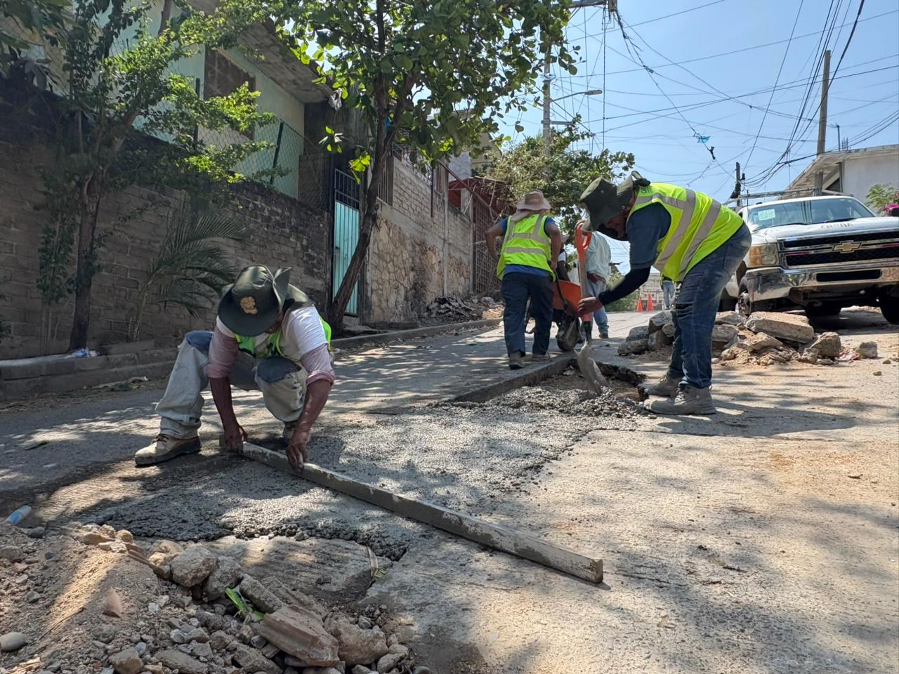En materia de infraestructura urbana, brigadas operativas atienden la reposición de concreto hidráulico en vialidades previamente intervenidas por trabajos en la red de agua potable. Los trabajos se concentran en la calle Reforma Agraria, en la colonia Paraíso, y en la calle Radio Koko, en la colonia Nicolás Bravo, con afectaciones en distintos tramos de la superficie de rodamiento.