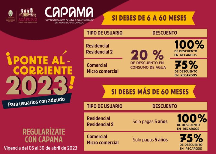 Acapulco, Gro., 05 de abril de 2023.- Siguiendo con el esquema de ofrecer facilidades de pago a los usuarios, la Comisión de Agua Potable y Alcantarillado del Municipio de Acapulco (CAPAMA), a través de la dirección Comercial, puso en marcha la campaña “Ponte al Corriente 2023”.